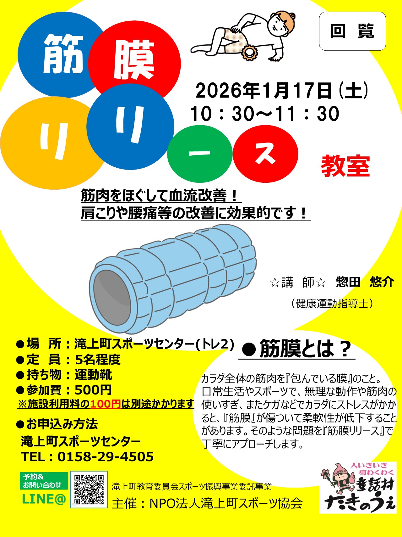筋膜リリース教室参加者募集中! 投稿日時: 2025年12月9日 投稿者: NPO法人 滝上町スポーツ協会 1月17日(木)10:30~筋膜リリース教室を開催いたします。参加者募集中です。詳細は添付チラシを参照ください。