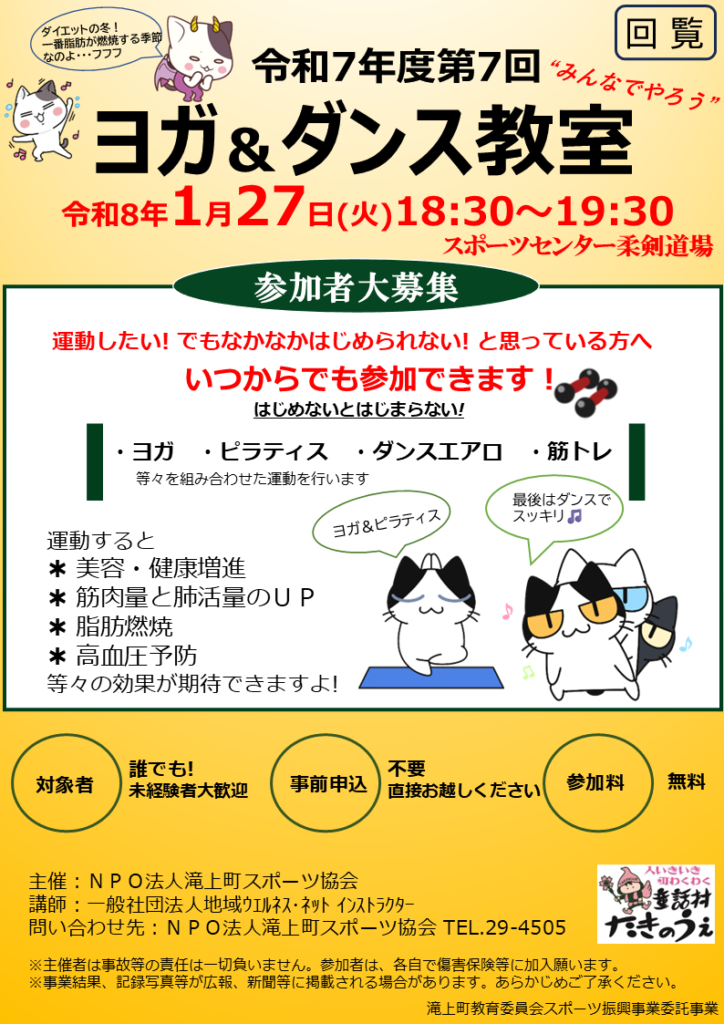 令和7年度第7回ヨガ&ダンス教室開催のお知らせ 投稿日時: 2026年1月7日 投稿者: NPO法人 滝上町スポーツ協会 1月27日(火)18時30分~、第7回ヨガ&ダンス教室を開催いたします。参加者募集中です。詳細は添付チラシを参照ください。