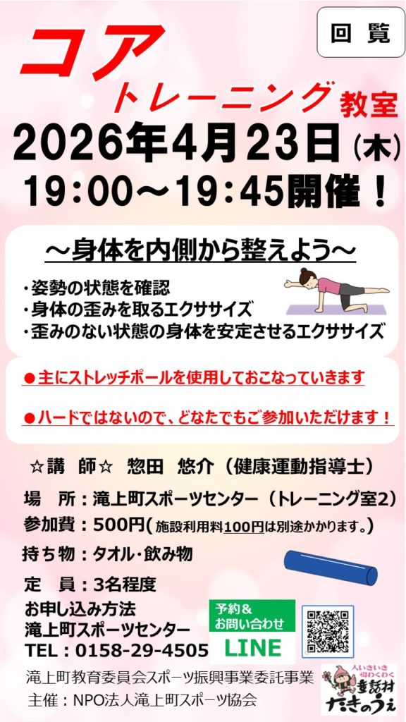 コアトレーニング教室参加者募集中! 投稿日時: 2026年4月1日 投稿者: NPO法人 滝上町スポーツ協会 4月23日(木)19:00~コアトレーニング教室を開催いたします。参加者募集中です。詳細は添付チラシを参照ください。