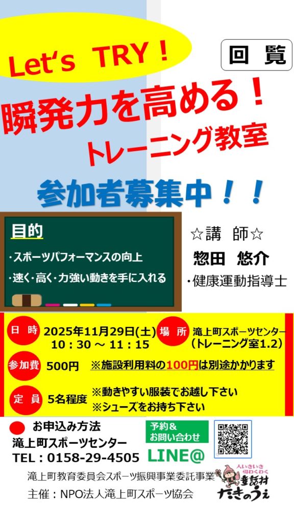 11月29日(土)10:30~瞬発力を高める運動教室を開催いたします。参加者募集中です。詳細は添付チラシを参照ください。