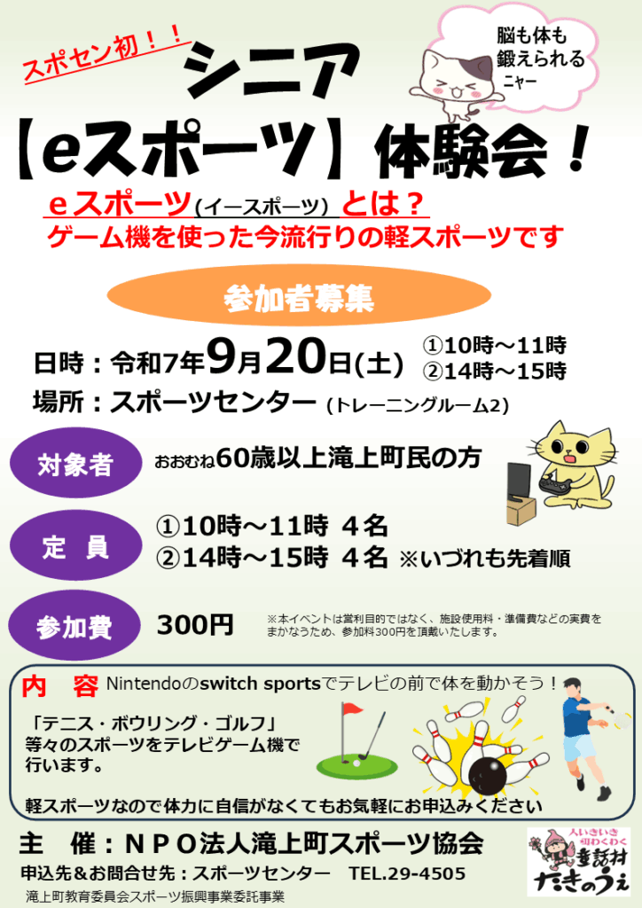 9月20日(土)に、滝上町スポーツセンター初のシニア向けeスポーツ体験会を開催いたします。テレビゲーム機を使った今流行りの軽スポーツを体験してみませんか?参加者募集中です。詳細は添付チラシを参照下さい。